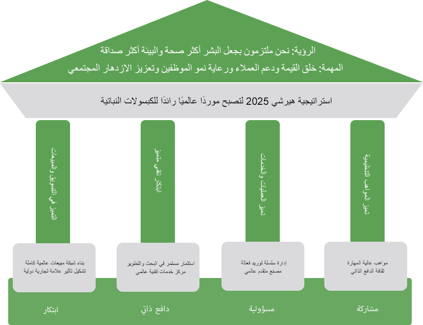 تلتزم هيرشي دائمًا بدفع المؤسسة نحو التنمية الخضراء والصحية والمستدامة من خلال الابتكار التقني. وقد وصلت تقنية العمليات إلى مستوى متقدم عالميًا. وقد نجحت في حل مشاكل مثل انكماش الكبسولات النباتية بفقدان الماء، وترسب معلق الغراء أثناء التغطيس بالغراء، وعدم اتصال الإنتاج، وعدم تجانس سمك جدران الكبسولات، والاختلاف الكبير في وزن الحبيبات، وانخفاض معدل المنتجات النهائية. ويمكن التحكم في وقت تفكك كبسولات هيدروكسي بروبيل ميثيل سيليلوز الفارغة المنتجة، وتحقيق تحكم مرحلي في وقت تفكك الكبسولات، لتوفير المزيد من الخيارات لمتطلبات الكبسولات لشركات الأدوية.